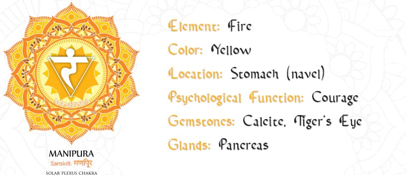 Healthy solar plexus chakra vibrates to the color of yellow, with fire as its dominant element. The Sanskrit name for solar plexus chakra is ‘Manipura’, which translates to “city of lustrous jewels”, where mani means jewel, and pur means city.